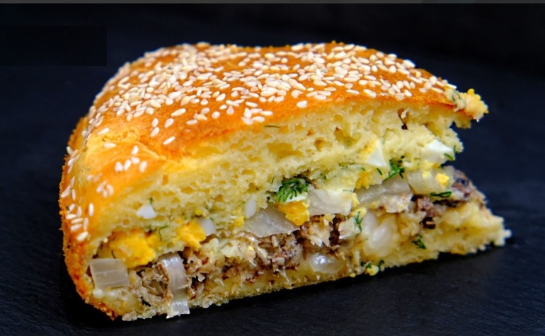 4. Дно формы выстелить пергаментом, стенки и дно смазать растительным маслом. Вылить половину теста, выложить сверху рыбу, замаринованный лук, яйцо и укроп. Залить второй половиной теста. Посыпать сверху кунжутом.