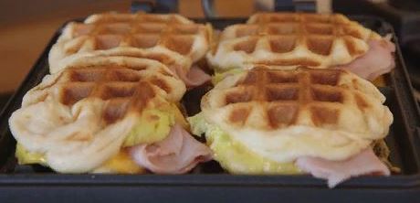 Выкладываем начинку между вафлями и па пару минут еще раз ставим на разогретые панели Венские вафли