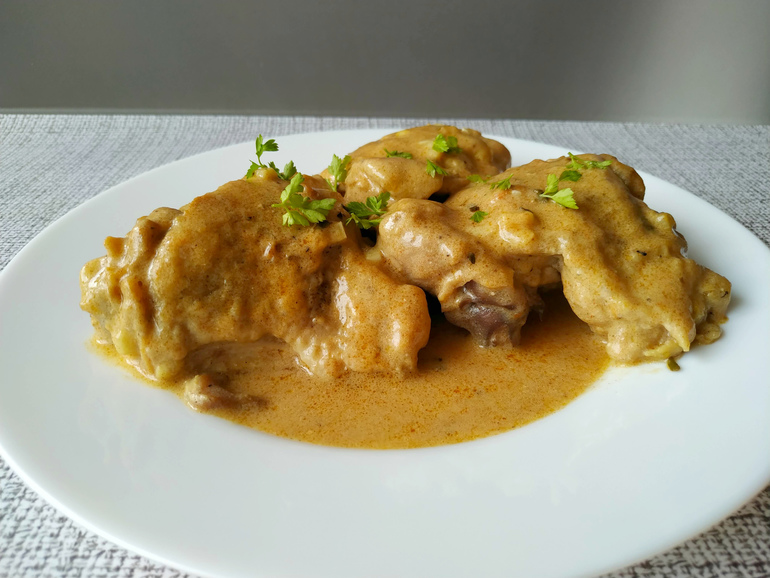 Блюда из птицыСегодня готовлю простое, нежное и ароматное, уютное и по-домашнему вкусное горячее блюдо. Курочка в бархатистом нежном соусе получается просто нежнейшей. Блюдо подойдет к любому гарниру и готовить просто. Затрудняюсь даже определить, что в этом блюде вкуснее: курица или подлива. Все съедается подчистую.