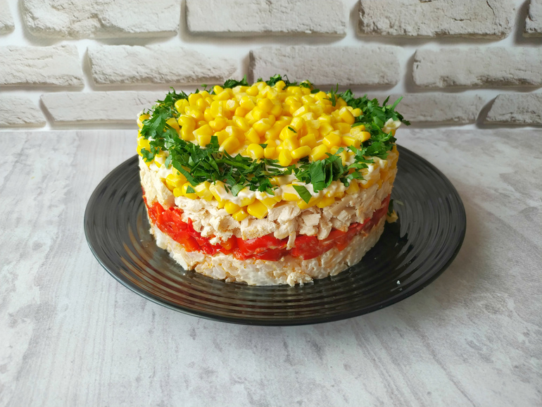 5. Последним слоем выкладываем кукурузу, и смазываем майонезом.