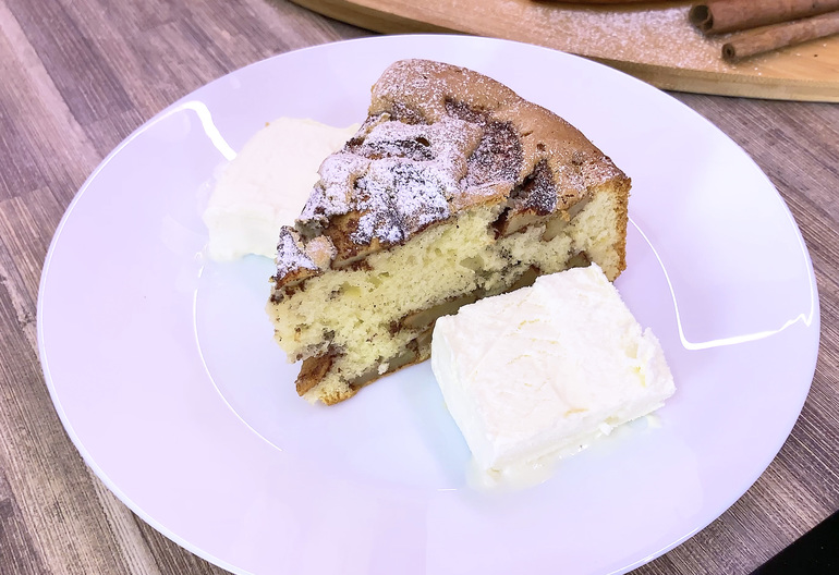 1. Выложить первую часть теста и сверху уложить яблоки, затем залить второй частью теста и сверху выложить оставшиеся яблоки.
