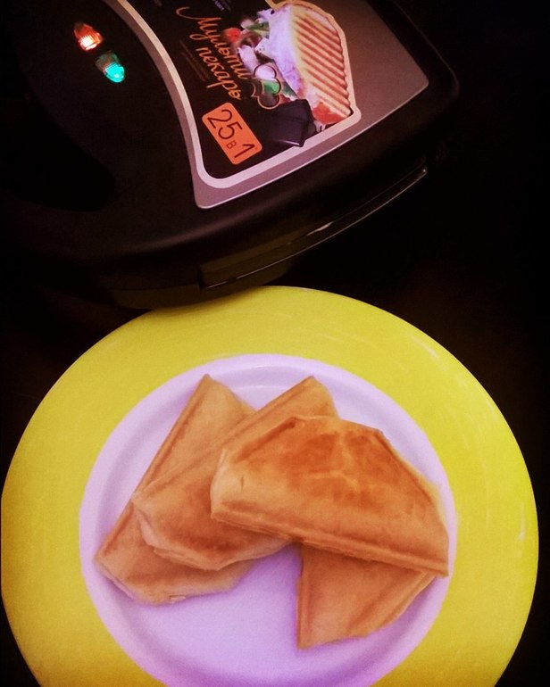 Ставим гриль или сендвич панели, нагреваем. Формируем пирожки. Для сендвич панелей можно просто раскатать тесто прямоугольником и выложить начинку, панели разделят тесто сами. 10 минут, пирожки готовы!