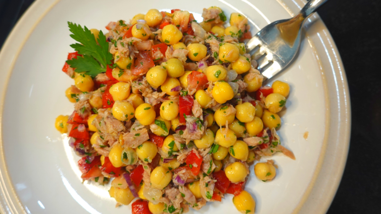 ВКУСНЫЙ САЛАТ С КОНСЕРВИРОВАННЫМ ТУНЦОМ И НУТОМ ПО-ИСПАНСКИ.