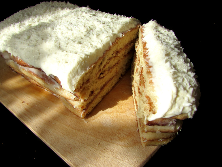 🍴Пропитка полностью впиталась и с утра сверху нанесла 50 гр.сметаны+1 ст.л. сахара+20 гр.масла(растопленного) - взбить и на верхний корж. И засыпала кокосовой стружкой.