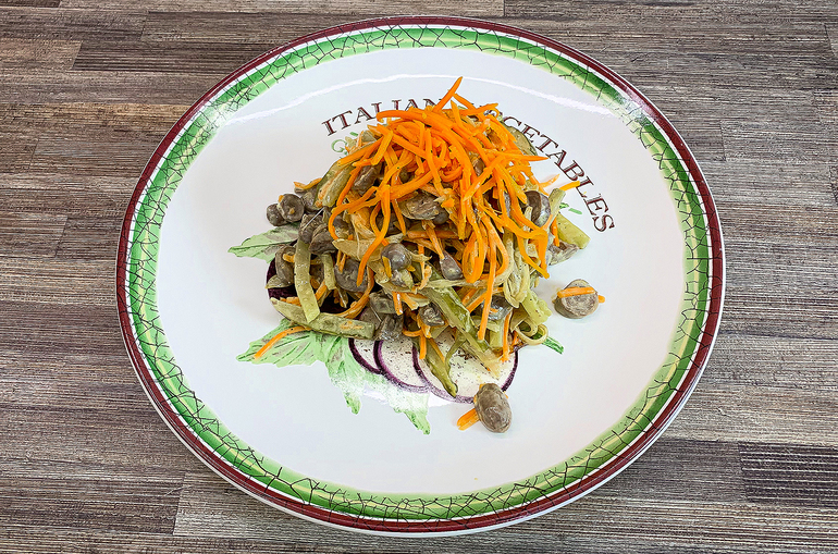 Сердечки нарезать кружочками и смешать с луком, добавить морковь и нарезаные соломкой огурцы.
