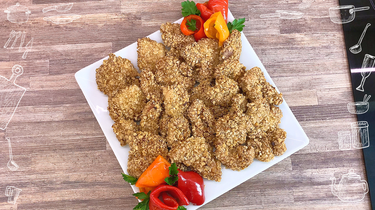 Разогреть масло в сковороде, обвалять кусочки филе в овсяных хлопьях и обжарить с двух сторон по 2 минуты с каждой стороны.