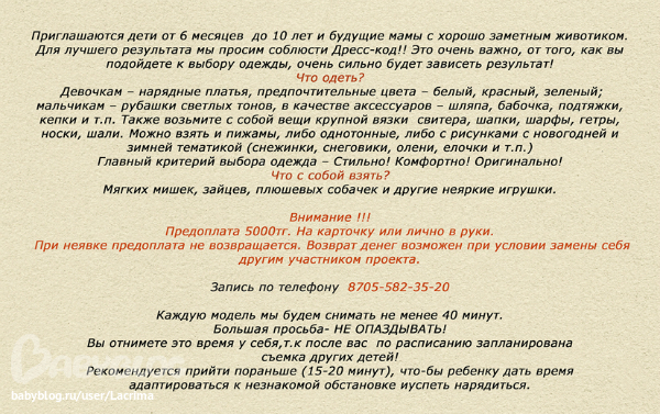 Юлия в Казахстан 13 лет Представляем вашему вниманию наш новый фотопроект "НОВОГОДНИИ ИСТОРИИ"!!! Разное Посмотрите еще 20 записей на эту тему Отменить Ответить Akdi Прошу прощения, а если с двумя детьми прийти(брат и сестра), платить за каждого по 25? или можно вместе их фотать и выйдет как за одного? 31.10.2012 Ответить Юлия Да можно вместе. 31.10.2012 Ответить Приглашаю!! Приглашаем!!! Чаты Беременных Выберите чат: Январята-2026 Февралята-2026 Мартята-2026 Апрелята-2026 Майчата-2026 Июнята-2026 Июлята-2026 Августята-2026
