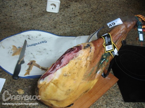 а у нас все едят хамон)) это сырокопченая свиная нога (задняя я думаю). вот это запретили категорически. плюс все колбасы местные - это фактически слегка обработанное мясо или кровь запихнутые в оболочку. хамон вот так выглядит))) да простит меня автор темы))))