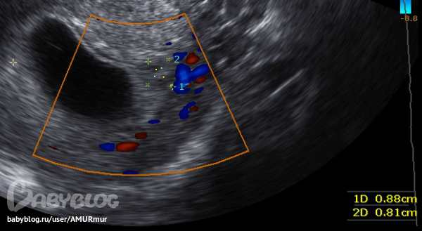 Сижу как на иголках два часа, ищу на бб подтверждение, что мазня темно-красная, это вовсе не мазня))) Ну правда испугалась. В общем, накрутила я себя ужасно. У директора отпросилась на "снимок пазух носа" (а что? я же еще с секретиком в животе, а про насморк и не соврала, была бы не беременная, может и правда отправилибы на снимок, а так - нате мазь, мажьте) и в 15:00 улетела на платное узи. Добралась быстро и уже в 15:40 нас с малявочкой смотрели. Хотя сначала все выспросили - какие выделения, что болит и пр., а потом посмотрели окружение плода. Итог исследования: в области внутреннего зева ретрохориальная гематома 8х8мм.