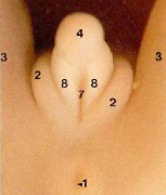 1. Анус 2. Губно-мошоночные бугорки 3. Ноги 4. Половой бугорок 7. Углубление уретры 8. Половые складочки