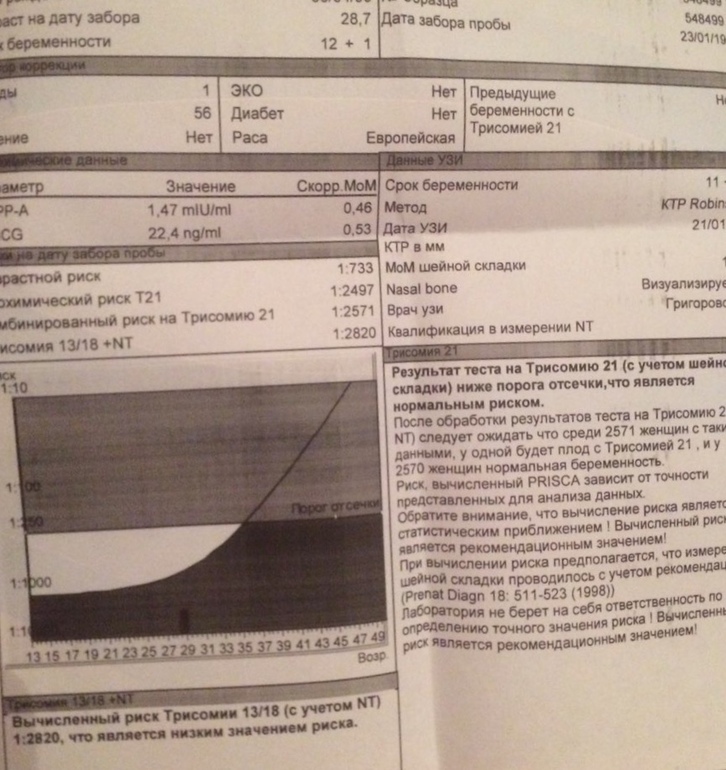 Написали что Результат теста на Трихосомию Т21 ( с учётом шейной складки) ниже порога отсечки, что является нормальным риском.