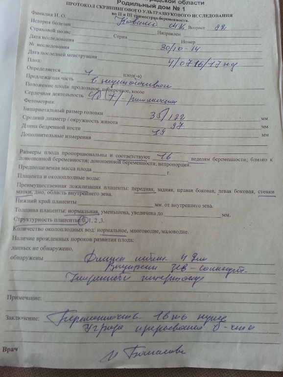 Вышла я оттуда счастливая, довольная, всё посмотрела, налюбовалась, но решила прочитать заключение, уже уехав из роддома, и не могу разобрать что написано... Вижу что беременность 16 нед... а след. слово? А с чего это угроза прерывания б - ????....это что вообще???мне ж сказаали всё у вас хорошо....не переживайте...и я не слышала чтоб у зистка говорила своей помощнице писать угрозу в заключении, сказала написать умеренный нипертонус...ну его то я вижу в заключении, а угроза то с какого перепугу?это чтобы так...не переживала так сказать по их словам??...к врачу только 5 ноября((( Скидываю фото заключения, и со всеми показателями...