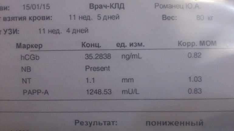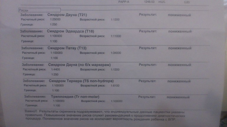 Во всех синдромах результат ПОНИЖЕННЫЙ, внизу ссылка Важно! Результат пониженный не исключает вероятность рождения ребенка с ВПР!