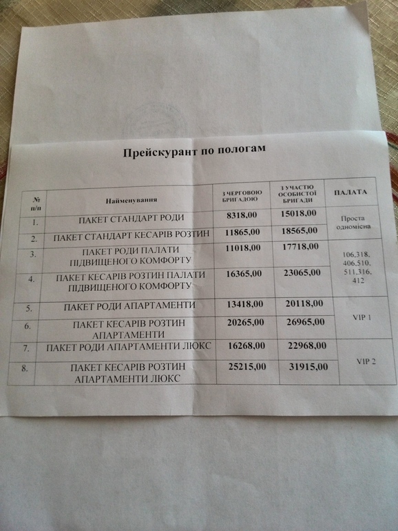 Без договора по прописке принимают роды бесплатно и палата бесплатная 3 местная, медикаменты за свой счет. Или же по договору с деж бригадой или с дог врачем в одноместной палате (вип не вип), но в эту цену входит все все все (медикаменты, эпидуралка, палата, благотворительный взнос и т.д.) поэтому пакет за 4000 грн с одноместной палатой и дежурной бригадой даже чем-то не плох для тех, кто не по прописке и у кого немного денежек.