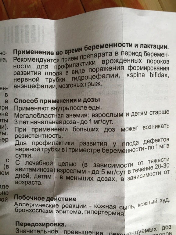 У женщин с лечебной целью дозу могут увеличивать до 5 мг в сутки. Курс лечения составляет 20-30 дней. Высокие дозы фолиевой кислоты в период подготовки к беременности и в первой ее трети назначают также женщинам, у которых уже были случаи рождения детей с фолиевозависимыми пороками развития.