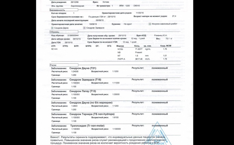 ну там ничего не отмечено галочками,и не написано типа"высокий риск "или "положительно",значит нету никаких заболеваний.а по цыфрам я не скажу.
