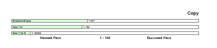 У Вас повышен свободный бета-ХГЧ - 6,11 МоМ. Но риски низкие. Думаю что ничего страшного нет. У меня по первому скринингу тоже был бета-ХГЧ повышен. Для своего успокоения сдавала в 16 недель второй скрининг - все оказалось в норме.
