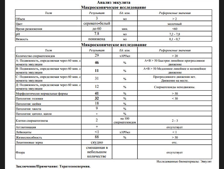 У нас была тератозооспермия и еще агглютинация, ходили к андрологу, назначил кучу анализов сдать, мы отложили на месяц, т.к.с деньгами проблемы были, решили витамины купить и пропить, через месяц узнала что беременна, был страх, но все сложилось хорошо, сейчас на 33 недели..