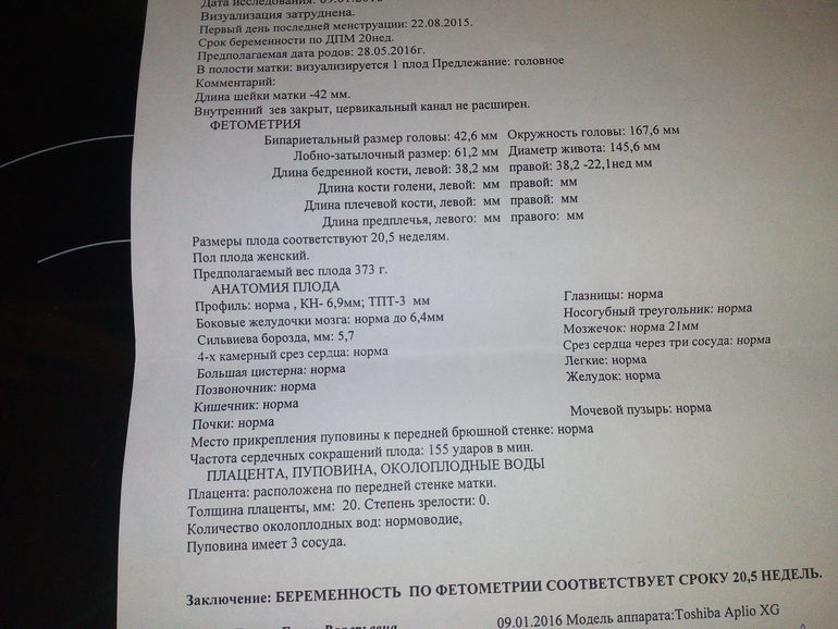 Проходила я исследование 09.01.2016г. на сроке 20 недель ровно. По УЗИ ставят срок 20,5 нед. Все хорошо. Плацента поднялась с 2,4 до 7,5см. Фото исследования прилагаю. Девочку подтвердили второй раз. Ходили с мужем, я думала во время УЗИ, что он наверное ничего не понимает из того, что показывают на экране))) А потом, когда я спросила врача можно ли посмотреть малыша в режиме 3 и 4D, она говорит- можно конечно, но малыши на таком сроке не очень красивые, они как сморщенные старички, т.к. нет подкожно-жировой прослойки. А муж говорит врачу- "Вы что, да она красавица!!!" Я думаю, ну надо же, на простом УЗИ разглядел, что доча у него красавица))) Приятно...