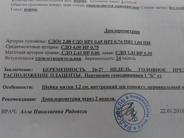 Результаты: УЗИ, КТГ, доплера, скринингаЧто-то я не пойму ничего. Надо было в Москву все-таки ехать. Тут не все померяли, кажется. Короче, со слов врача превышен кровоток в одной из артерий пуповины. И в одной маточной (в правой кажется). Поставила нарушение гемодинамики степени 1Б.
