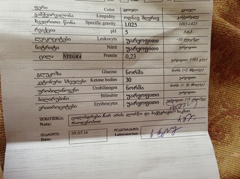 Анализы, инфекцииИли может кто просто знает Грузинский язык! Находимся на отдыхе в Грузии, я сильно заболела, сдала все анализы, врач говорит моча нормальная, но у меня есть сомнения((( может кто понимает, что тут написано и какие отклонения от норм? 🙁 Фото под кат