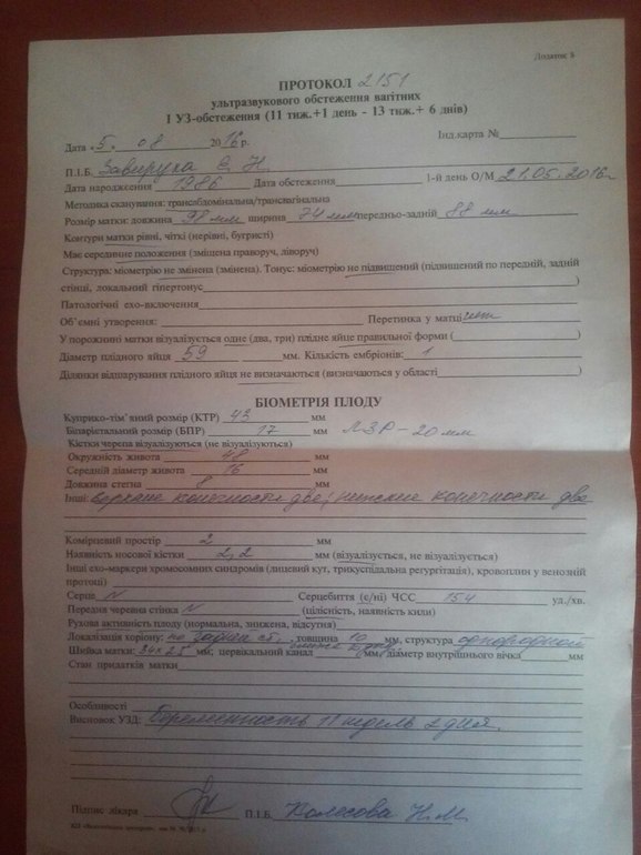 По узи мне поставили 11 недель 2 дня. КТР - 43 мм - а скрининг проводят при КТР 45 мм минимум, вообщем ТВП - 2мм, Носик - 2,2 мм (видно отлично было), БПР-17 мм, бедро - 8мм. Узистка сказала, что хорошие показатели. А мне БПР многоват(((((