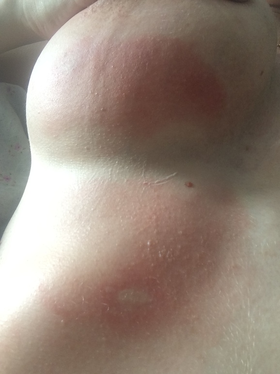 У меня еще больше грудь, тяжело носить.Одна кг 1.5,че после родов будет представить боюсь.Перешла на бюст для кормления хлопковый и все раздражения ушли.Но на фото вас че-то грызануло.Похоже на комара, содовые растирки хорошо помогают от укусов, а от потницы под грудью я мазала чистую кожу спиртом потом присыпкой детской
