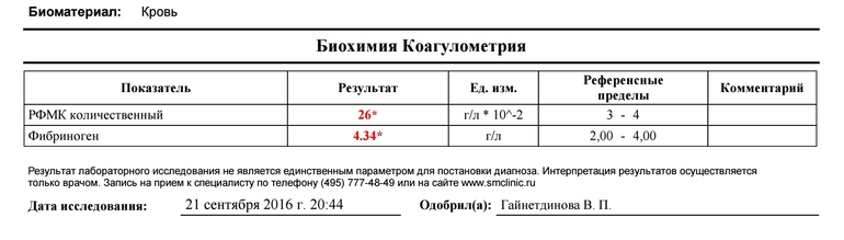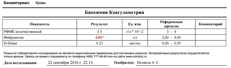 Сначала мучали фибриногеном и РФМК. Выше, видители, чем норма у небеременного мужика, блин. А с д-димером все ок. Посоветовали консультацию гематолога в той же клинике. Спросила зачем, аргумент - у вас же целых два показателя чуть выше нормы. Я была в шоке, что моя гиня не в курсе, что при повышенном фибриногене РФМК ну никак не останется неизменным. Отказалась. наверное обидела, потому что через неделю мне выдали вот такой результат: