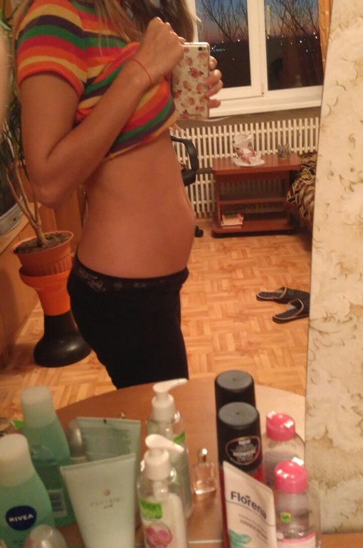 Фото нету, но могу сказать что я начала себя ощущать беременной где 18-19 недель, когда уже реально животик вылез а не кишки))) и стала чувствовать малышку! Беременность вторая!!! Хотя и говорят что со второй беременностью все быстрее произходит простите но ни фига, все так же что и спервой