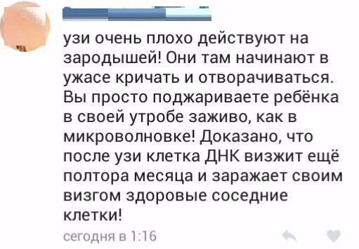 Бред,ерунда)) девочки,ну это ведь шутка,просто многие боятся узи и считают его вредным)автор этого апогея, просто посмеялся и выразил в такой форме 😁😁😁👍
