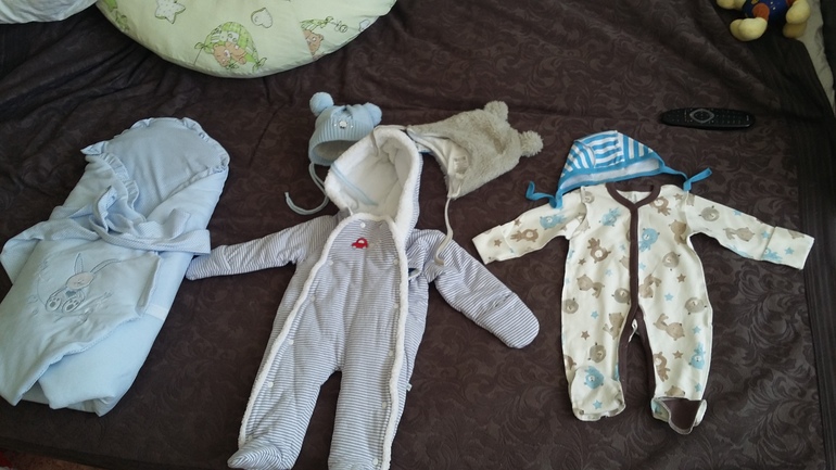 Шапки две, обе на 0 мес но размеры совсем разные. Какая подойдёт. Комбинезон 62 (с учетом носки весной), всё остальное 56. Конверт димесезон.