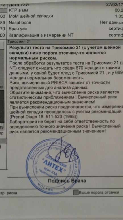 Результаты: УЗИ, КТГ, доплера, скрининга9 марта переживала здесь про скрининг. Сегодня сходила в генетику в ЦПСиР. Врач сказала, что риски маленькие и для моего возраста хороший результат, что у меня нет показаний для дополнительных исследований. Сказала, что программа по которой считали риски уже устарела и по новой программе риски были бы еще ниже. Я успокоилась и буду ждать следующего узи на сроке 19-20 недель, как и советовала врач. Всем спасибо, кто помог пережить эти переживания!