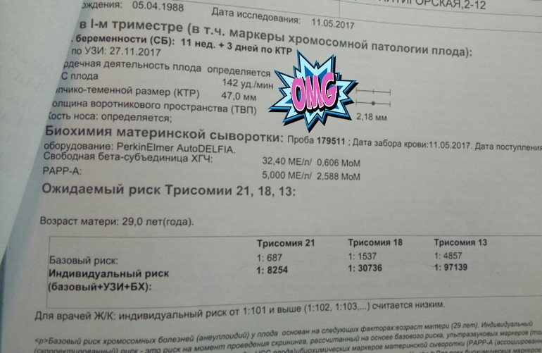 Хотя, у вас посчитаны такие низкие индивидуальные риски, при таком большом разбросе ХГЧ и РАРР-А (0,6 и 2,58) такого не было бы. Если посмотреть таблицы, то у вас в 13 недель все значительно ближе к медиане, вообще практически 1. Единица МоМ ХГЧ на срок 13.6 недель равна 30, РАРР-А на срок 13.6 равен 5.