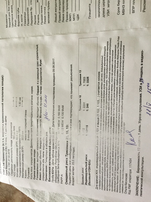 Бета ХГЧ и РАРР-а конечно очень низкие. Поэтому и выдало трисомию 18 в десять раз выше базового (возрастного): 1 к 246, а трисомию 13 в два раза выше . С таким риском я бы пошла на доп. исследования.