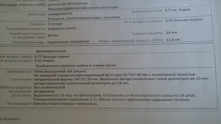 Результаты: УЗИ, КТГ, доплера, скринингаПриехала сегодня в Оренбургский роддом в 11.30 а попала в палату в 17.15. За это время: сделала 3 Узи, насиделась в очереди прождала то одного врача то другого, чтоб решить куда все таки меня ложить будут. Пока решили думала с голоду умру с утра ничего не ела, хоть в отделение попала на ужин сразу. Думала с этими ожиданиями на ужин опоздаю. Положили в гинекологию, т.к для роддома у меня срок должен быть больше 22 недель. Он у меня был по месячным как раз сегодня, но они решили отталкиваться от узи. По нему у меня 21 неделя отстаем на 8 дней. Вот результат одного из сегодняшнего узи. Главврач решил понаблюдать за мной в течении 10-14 дней , а потом будут дальше решать сто делать. Так что Верим и надеемся на чудо.