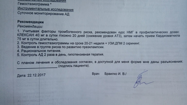 Клексан колоть и аспирин пить. Иначе никак. Врач только дозу подберет. Сдайте анализы которые я А Вам написала, может к приему успеют сделать их. Без них не понятно есть ли дефицит протеинов. Если они нормальные, то все терпимо. Я одного ребенка в 38 недель потеряла из-за высокого фибриногена (6.8) с ат-3 на нижней границе нормы и сниженныМ протеином S. Последнюю беременность вынашивать на 0.8 клексана и 75 кардиомагнила без отмены перед КС. Другого варианта не было доходить.