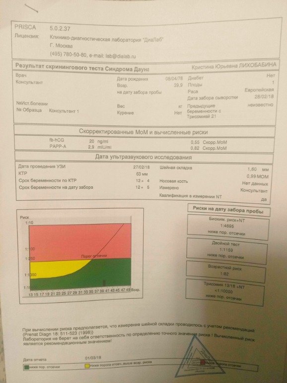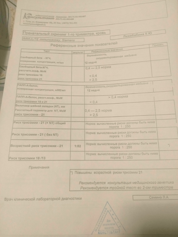 Результаты: УЗИ, КТГ, доплера, скринингаДевочки, помогите пожалуйста! Сижу плачу, ничего не соображаю! Получила результаты первого биохимического скрининга. Мне 39 .Возрастной риск Трисомии 21 - 1:82. Что такое возрастной риск - это среднестатистический риск по умолчанию? Индивидуальный риск - это 1:4695...я правильно понимаю или нет? По УЗИ все отлично у меня. Генетик только в начале апреля, очередь большая! Я очень переживаю! ....Один листочек два раза вставился, нечаянно.