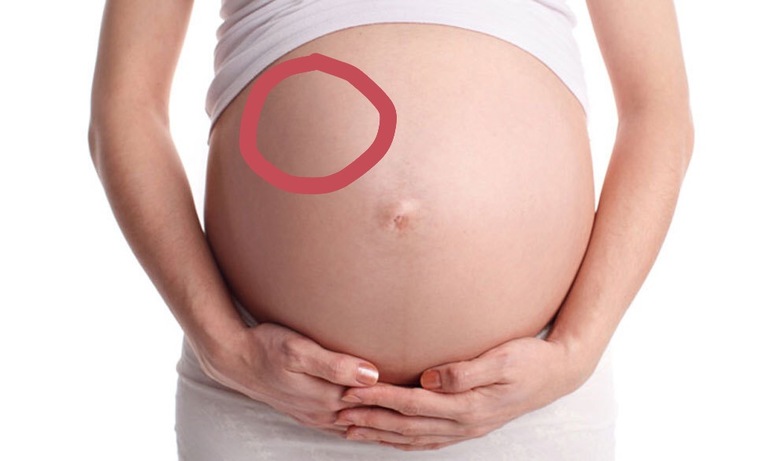 У меня икает внизу, что-то круглое выпирает там, где я указала на картинке, а пинает с другого бока ))
