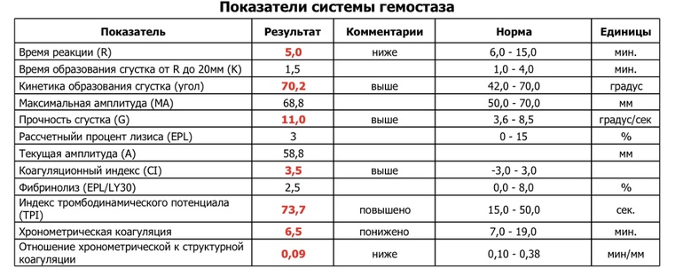 Мой совет: сдайте не только ключевые показатели, но и расширенную Тромбоэластограмму (прикрепила вам фото). Видите, у меня хорошие показатели на одном фото и увеличиваются уже на другом, поэтому лучше расширенный анализ сдавать. Хотя 2 месяца на клексане 0,4 всё идеально было, срок растет, гемостаз меняется. Я сдаю при своей клинике, часто при эконшных клиниках такой анализ делают, этот от лаборатории Архимед. И вот смотря на второй анализ, врач мне к клексану 0,4 добавила курантил. Завтра буду пересдавать, дай Бог снизился!