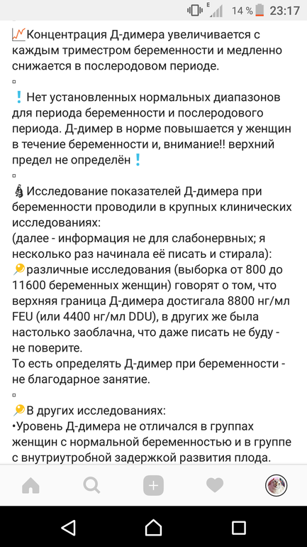 Вы даже себе не представляете скооолько литературы я перечитала и со сколькими людьми общалась. Есть нормы, но они гораздо выше. До 3000 макс, когда у небеременной до 0,5. О 10 и 20 тыс ни разу не слышала. Успокоиться не могу, т.к коллега в 39 недель потеряла ребенка, тромб в плаценте. Да и тут общалась с девочками м такими историями. Значит, все таки важен он...
