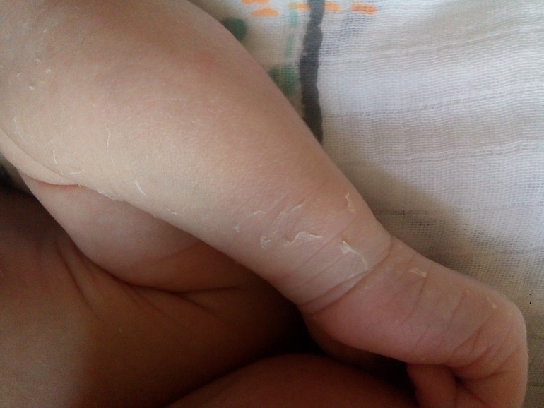 Так в том-то и дело, что у не переношенных, есть ещё смазка на коже, защитный слой от воды. Когда ребёнку пора родиться, этот слой истончается, а если он запаздывает родиться, то получается, что плавает в этой воде без защиты, от того и кожа потом слезает. Есть специальный термин для этого, который у меня сейчас из головы вылетел. Поэтому да, это именно признак переношенности. Об этом, кстати и врач говорил.