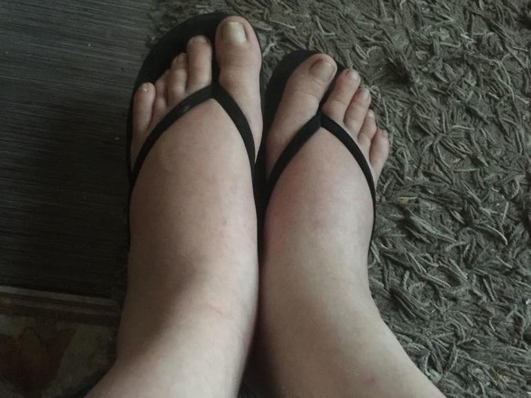 Мне помогает лежать в прохладе с ногами как можно выше. Выглядит страшновато конечно это все, ничего кроме тапочек как на картинке носить не могу.