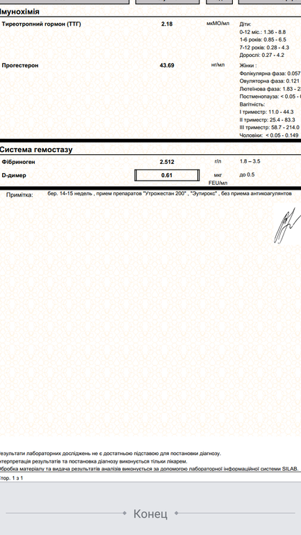 Анализы, инфекцииПовышен д димер,только получила анализы,нормы указаны стандартно,лаборатория Синево ,скажите ,для беременных такие же показатели? 15 я неделя в первом триместре был 0.15... в селе гематолога нет,бегом искать его или норм показатель? И прогик с. Утрожестаном 400 был 72,теперь ставлю 200,он 43 ,норм,не повышать?
