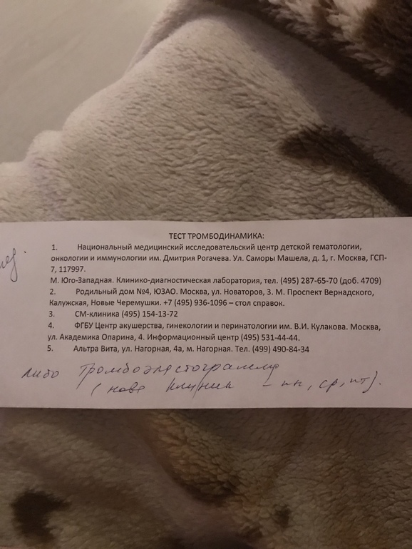 Вопросы про УЗИ, обследования и анализы: что, где, как, когда?Добрый день. В начале Б сдавала «на всякий случай» гемостаз, все было в норме. Сегодня планово была в ЖК , врач сказала , что надо сдать гемостаз и дала направление. Сказала, что немного повешены тромбоциты, но ничего страшного, так как пью Дюфастон 3 раза в день. Собственно очень ищу хорошего и проверенного гематолога и хотелось бы послушать ещё мнения, ждать ли 10 дней, пока результаты в жк придут и ничего страшного правда не случится или бежать платно сдавать гемостаз, а может и ещё подскажете, что сдать по крови и к врачу на платный приём. Беременность 14-15 недель. Спасибо