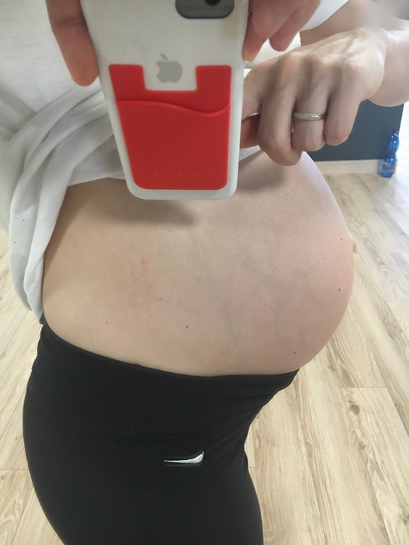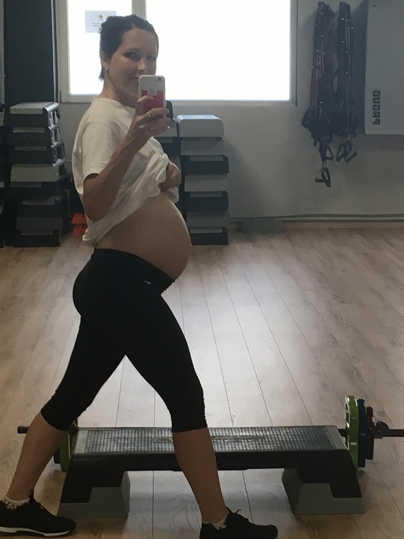 Ну а теперь о более приятном. Я все еще хожу в зал. Фото ниже. Живот уже приличный, но я стараюсь уединяться в зале для групповых занятий, тогда намного комфортнее заниматься.