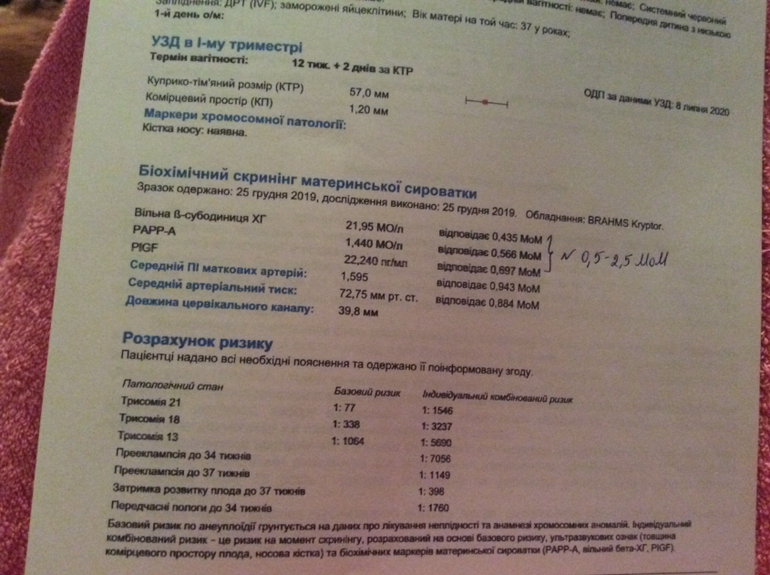 Результаты: УЗИ, КТГ, доплера, скринингаИтак, после результата Prisca, с низким папп-а и высокими рисками, сдала кровь для расчёта программой Astraia. Только что вернулась с консультации генетика. Программа более современная, учитывает большее количество данных узи и даёт более расширенный прогноз по позднему течению беременности и возможных осложнениях. Фото добавлю ниже. Генетик успокоила, сказала, что высоких рисков нет ни по одному показателю. Кровь в пределах нормы. Рекомендовано немного раньше пройти второй скрининг для оценки более поздних эхо-маркеров, и сдать биохимию крови, также на доплере контролировать кровоток в артериях. Сказала успокоиться и наслаждаться беременностью, что я и собираюсь сделать. Теперь у меня будут вопросы к моему гинекологу, зачем делать на устаревшей программе скрининг, если есть более новые и актуальные? Девочки, беременность веду в частной клинике, деньги за пакет оплачены не малые, и такие нервы пережила((( У них в пакете два скрининга приска, буду говорить об отказе от второго на этой программе.