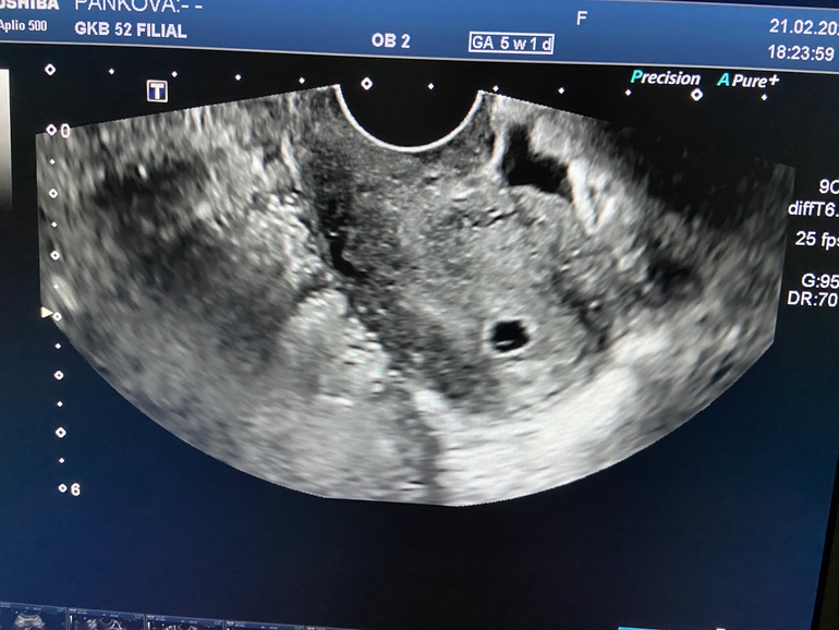 Результаты: УЗИ, КТГ, доплера, скринингаЗдравствуйте, подскажите нельзя ли предполагать что ПЯ не одно? Или подскажите кто знает, что за чёрные пятнышки рядом) 5 недель)