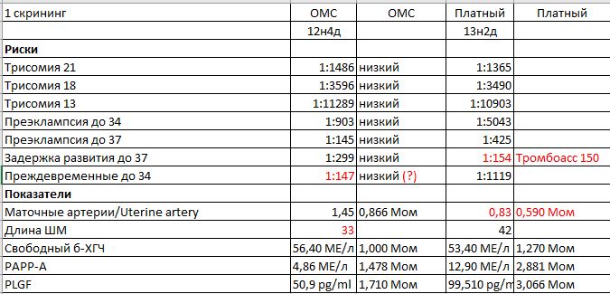 Сравнила 2 1х скрининга в 12 и 13 недель.
