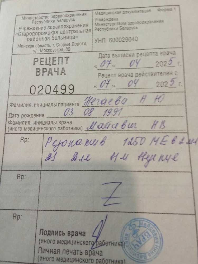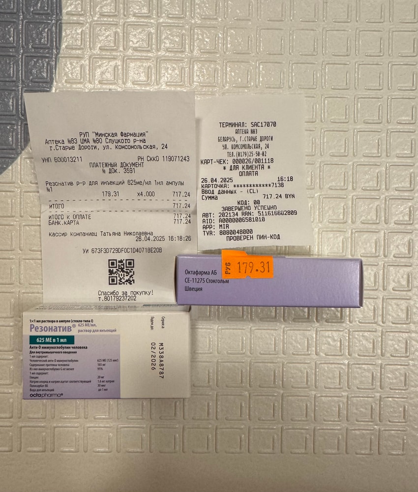 Резус-конфликтПродаю 2 пачки для введения 1 дозы антирезусного иммуноглобулина для беременных. Были куплены для введения на 32-ю неделю и роды сразу 2 дозы (4 пачки), в связи с отсутствием данного препарата в городе. На момент родов в крови были антитела и укол не понадобился. Куплен через врача в Белоруссии с официальным рецептом, перевезен и хранится в холодильнике. Введение препарата возможно по направлению врача в клинике Скандинавия. Фото и чеки прикладываю