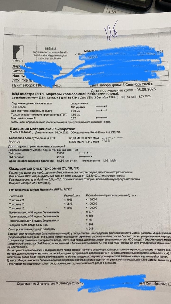 Риски минимальные по трисомии, но обратите внимание на риск прэклампсии. Просто туда дальше отслеживайте